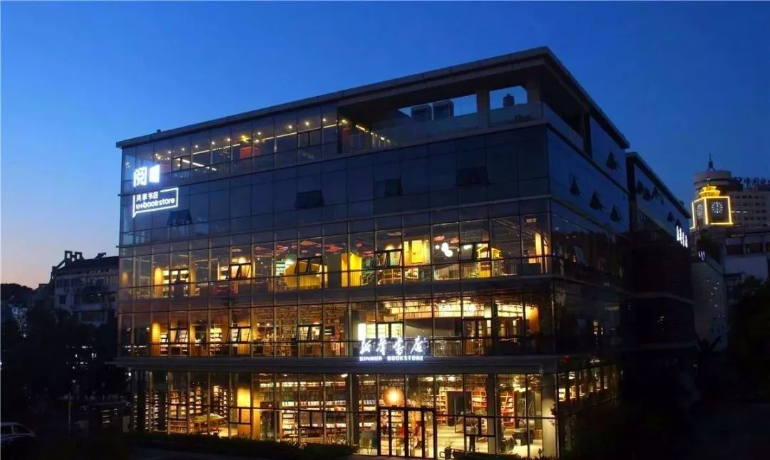 黄山阅+共享书店是黄山市首家文化综合体,书店临江而建,共有五层,夜晚灯光亮起时,全玻璃式的外墙尤为引人注目。书店内部原木色的简洁配色让人舒适而安心,儿童书籍区的坐垫用的是五彩的水果图样配色,缤纷而活泼。