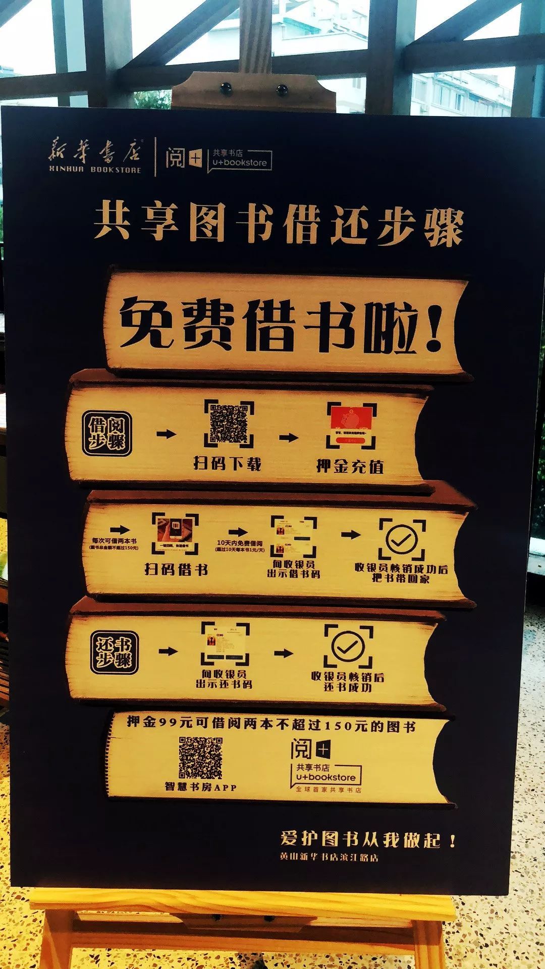 另外,比较吸引眼球的是书店提出了“共享”概念,读者可以将书免费带回家阅读,免费借书期满之后,可以“借转买”或者到店归还,非常便利。