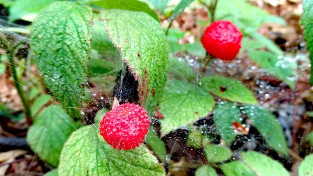 现在正是野草莓成熟的季节,路边随处可见诱人的“地莓”,红如玛瑙,我忍不住随手摘一枚放进嘴里,一股儿时的香甜立即涌上心头,让人久久回味。蹬道循溪而上,涓涓清泉滋养了两边浓密的柴草,刚刚凋谢了春花的猕猴桃藤现已挂果,和山楂差不多大小的果串,毛茸茸的,婴儿似的,透着青涩的光泽。路边的一株“树莓”(学名:覆盆子)已熟透,晶莹剔透的果粒子组成的树莓果子,一枚一枚地的挂在枝杈间,在绿叶中时隐时,小灯笼似的,大家迫不及待地驻足采摘。