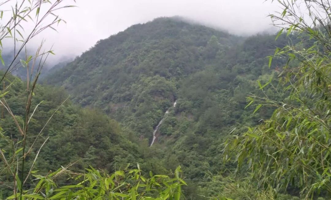 与只闻其声不见其形的溪涧相比,对面高耸入云的“百丈崖”上飞流而下的瀑布则有形有声,像一条白龙从漭漭青山中奔腾而出,巨大的轰鸣声响彻整个山谷。“百丈崖”崖顶上是一座古村,名“燕窠”,像燕子在房梁下垒砌的巢穴一样,高不可攀。从清凉峰上下来的雨水经过这个只有燕子才能飞上去的村庄后,从崖顶一泻而下,形成多条瀑布,直接跌落到山底的河谷上。瀑布下方一座单拱石桥横跨河上,桥高六七米,长十余米,如一道彩虹连接在古道和山崖之间。在绵绵细雨中,拱桥、清溪、银瀑、峭壁、修竹、青山,构成一幅生动活泼的天然水墨画。