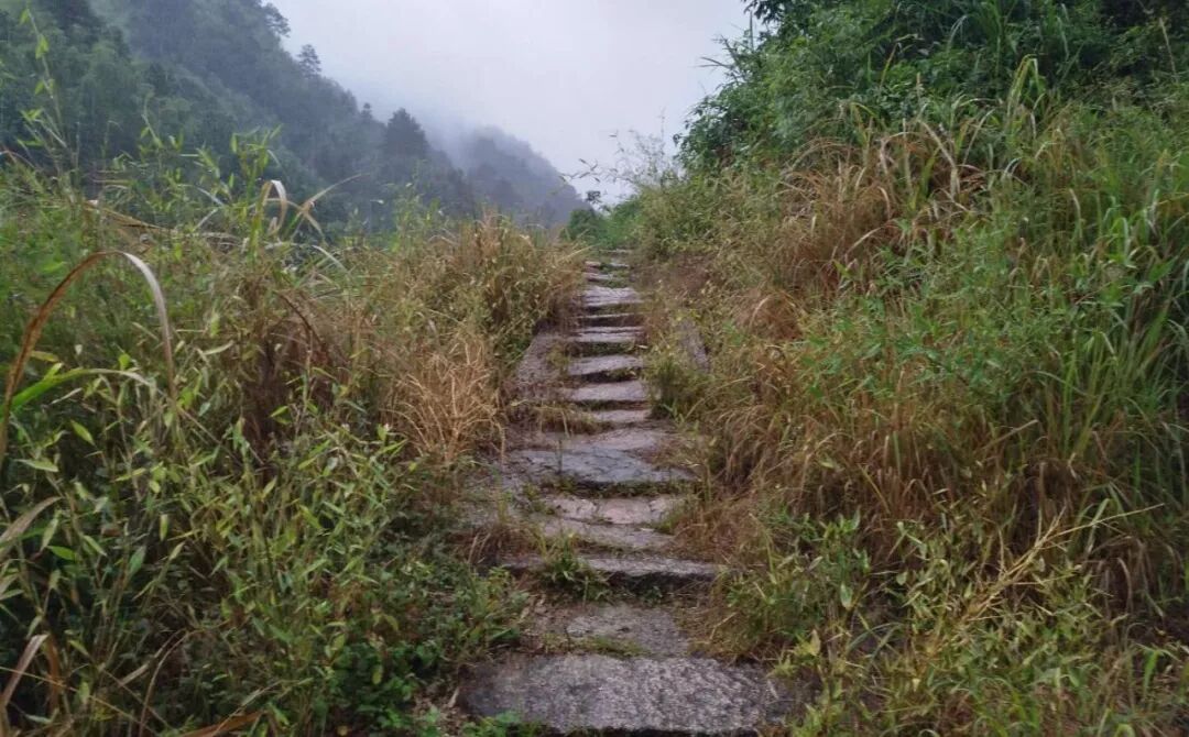 从郑家溪到峰高岭的古道是村民上山干活的重要步道,近年已修葺一新。干干净净的花岗岩路面历经数百年风雨洗礼,如今已磨砺得黄里透红,在雨水的冲洗下更显温润玉滑,似乎用脚轻轻一点,就能播放出当年商旅络绎的影像。当我们背着行囊,撑着雨伞冒着瓢泼大雨向峰高岭出发时,所见村民都投来惊异的目光,也许这种行色匆匆、风雨无阻的景象在这条古道上已消失了太久太久。今天,我们以这种近乎宗教仪式般的行走去感悟当年骡马脚夫翻山越岭、肩挑背驮的艰辛,那种苍凉和酸楚的历练,经过千百年岁月的沉淀,如今留在我们这些行走者心中的只有无尽的畅想和油然而生的敬畏。