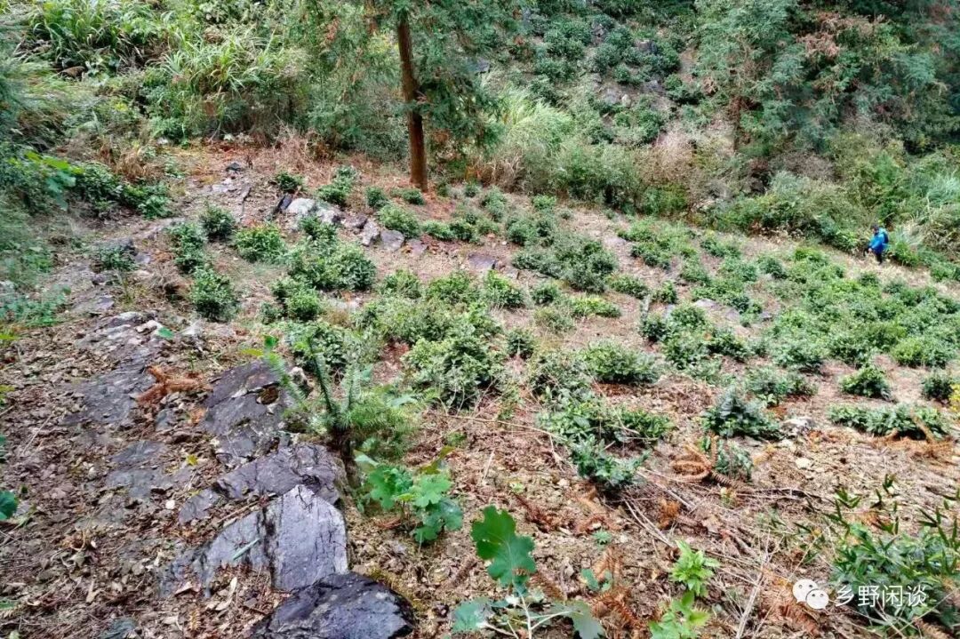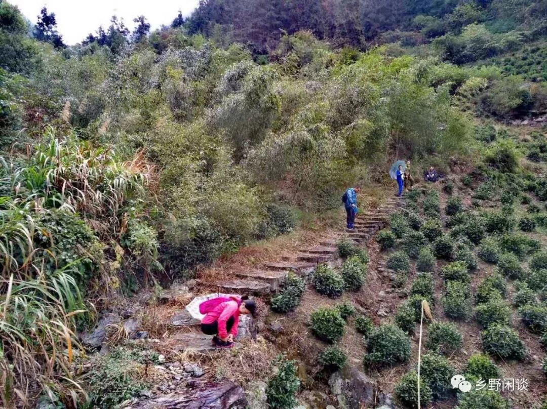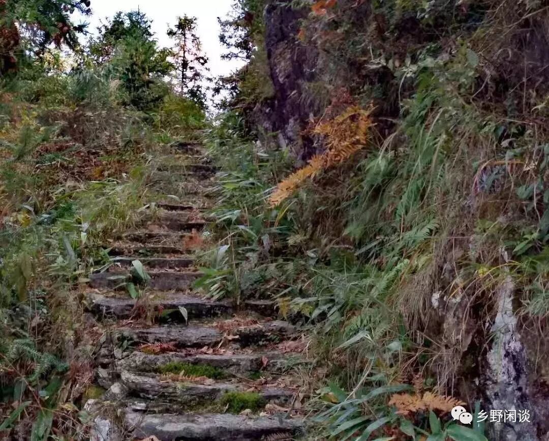 过了路亭,古道向山坳深处蜿蜒前行,随着山坞的深入,却发现古道并非我们想象的已修葺规整,路边的梯田已撂荒多年,两边的箬叶、柴草几乎遮盖了路面,“鸟道”之名恰如其分,要不是秋天草木枯萎,行走这样的山路是很危险的,轻则被草叶割破皮肤,重则与蛇蝎相遇。