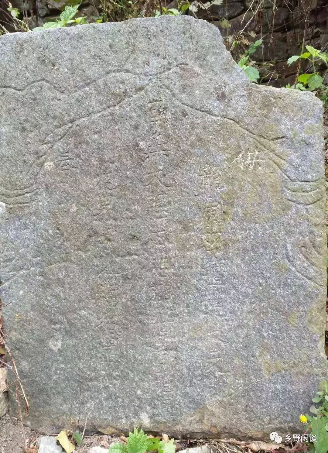 “柺”到山岭尽头是贤源岭垭口。垭口平坦,一亩见方,左有一坍塌的路亭遗址,对面是一条“走的人多了就成了路”的小路,通石耳山,每年映山红花开季节,可从此处登山赏花。路亭废墟上残留一截倒落在地的石碑,部分碑文尚可辨认: