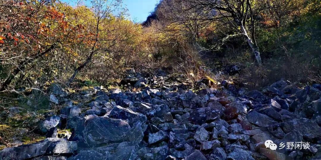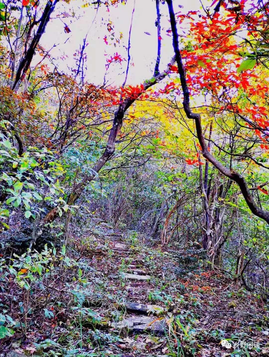 一切都在告诉我们,这里远离那个喧嚣的世界已很久很久,只有这些残存青石板、以及路边那几座残垣断壁的路亭还标识着这条古道曾经的规格,即所谓的官道。古道穿过两道小溪后基本沿山体攀高而上。我们从春天的繁花,走到夏天的深绿,到了绚丽斑斓的秋天,心情也随之饱满起来。尽管一路披荆斩棘、跨河过坎,行走在秋色里总是唯美的: 路边紫得雍容华贵的紫珠,红得冰清玉洁的山楂果子。远处猩红的野柿子,枯黄的板栗树,金黄的栎树叶间挂着一颗颗陀螺形的小果子。那些叶子红得透亮的不知是鸡爪槭还是五角枫,还有那些我叫不出名字秋叶,涂成山峦间不同色阶的景致。