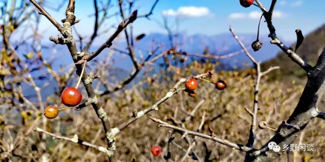 走在笔陡的山脊上,我们遇见了一株棠梨树,十几股细长的枝条上缀着稀稀拉拉的几片棕红的树叶,却未见一枚棠梨,不知是鸟儿捷足先登了,还是今年根本就没结果子。山脊上的灌木大部分是映山红,叶已脱落,赤裸的枝条末端举着一枚枚雀嘴般的芽头,棕黄色的花萼包裹着猩红的花骨朵,呼之欲出的样子。它们带着棠梨岭的铿锵之美,从秋走到冬天,明年春天,这里定是漫山红艳的景象。