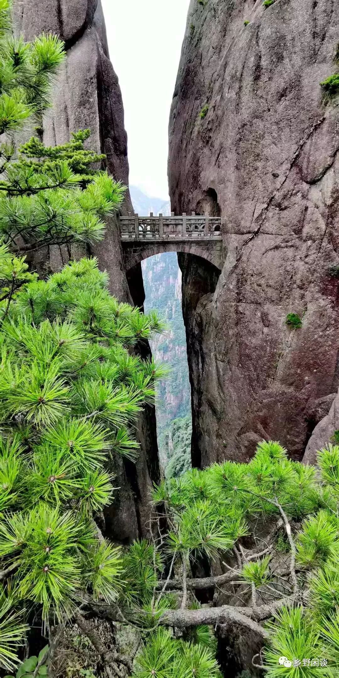 黄山之水云中来,云际峰东西之水都称为“白云溪”也未尝不可。早晨,山中天气清冷,我穿上冲锋衣,绑上护膝护踝,带上干粮,跟着天海管理处的“摸山”队伍沿步仙桥游道出发。步仙桥游道经石床峰、石柱峰,至三溪口,顺流而下至钓桥,其大部分路段穿崖过壁,绝处逢生,十分惊险。尤为“步仙桥”,凿隧洞于两山峰腰部,并架桥相接。人行桥上,上仰插天石峰,下临百米深渊,山风吹来,松舞风鸣,令人叹为观止,故为世界十大名桥之一,每年慕名前来者络绎不绝。