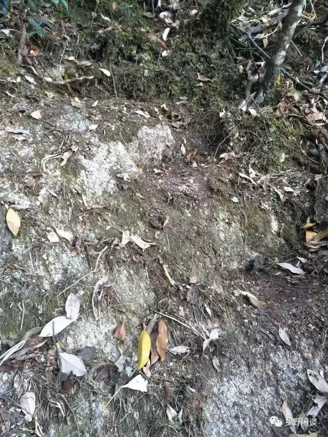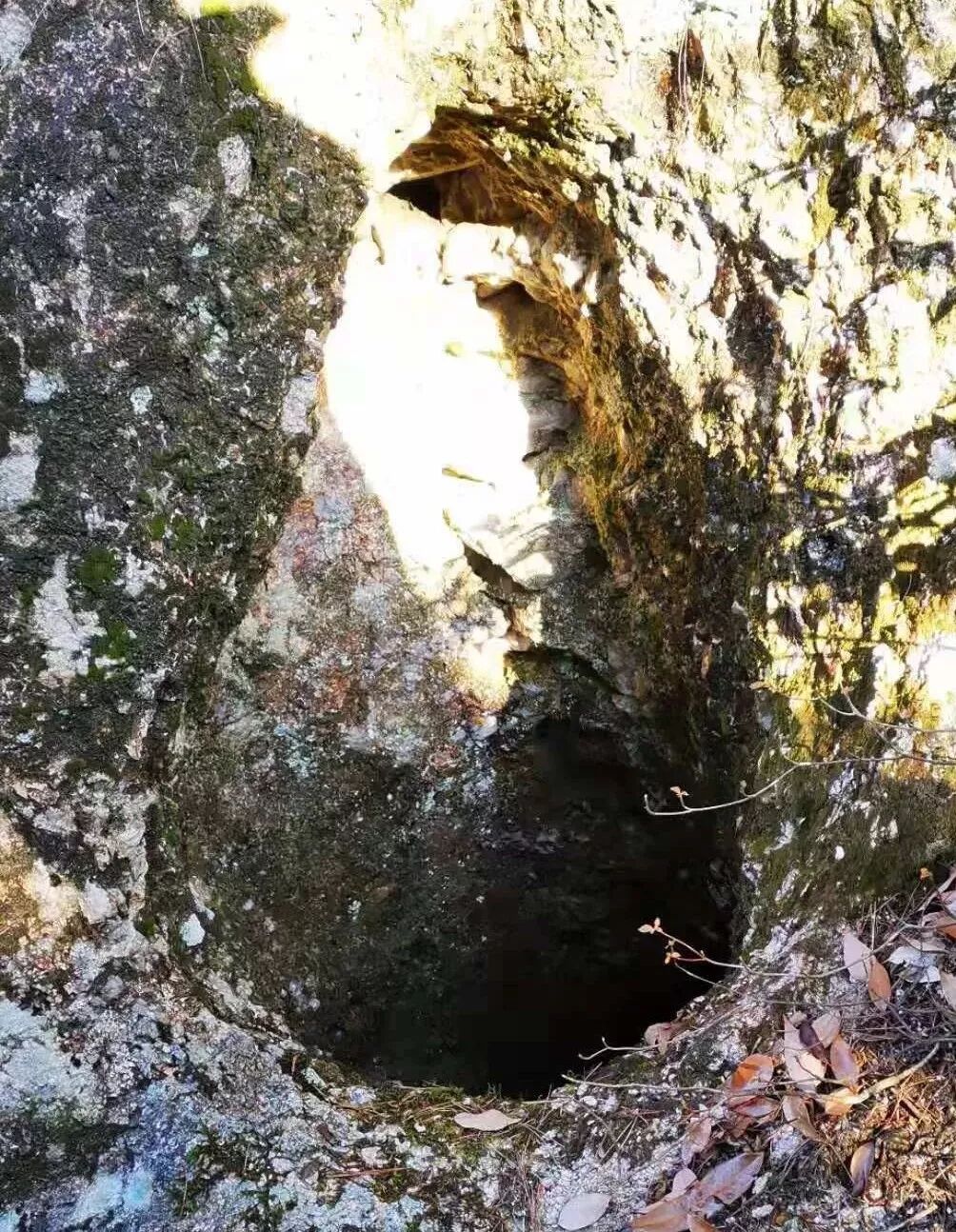 下行的山林虽然陡峭,偶有崖石阻路,但植被丰裕,林木稠密,行走难度不大。约半小时,我们在山腰一处相对平坦的地方暂歇。同行的C兄说,附近有一天然“水晶井”,可以去看看。水晶井位于一悬崖下方,因井壁缀满水晶石而得名,井口宽约六十公分,深达“四丈许”。当然我也不敢贸然下去试探,往下丢颗石子未闻回声也就作罢了。水晶井于深山密林中,如无人带路,殊难发现,据说洞内刻有“峨眉月痕”四字,至于何人何时所题并无记载。