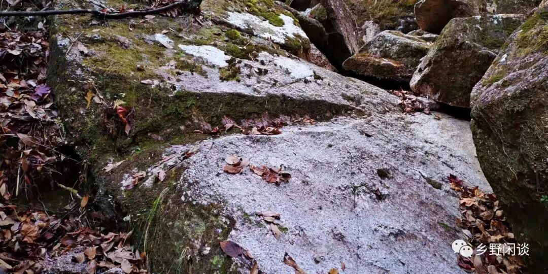 下行不远,即谷底,自天海流下来的水从这里流向白云溪,因持续干旱,溪中除了绒毯般的青苔外,已无一滴流水。溪边还有一处老庙基,规模不大,不足20平米。据C兄介绍,水晶井附近也有一处庙基,规模是这里的三四倍,天海下来的这片森林中还有几处庙宇遗址,但均未见有关文字记载。时光无言,山石有痕。虽然历史已将这些禅林庙宇淹没在岁月的烟尘中,但它们主人当年在崖石上凿出的蹬印、搭砌的石级却永远留在大自然的骨骼上。