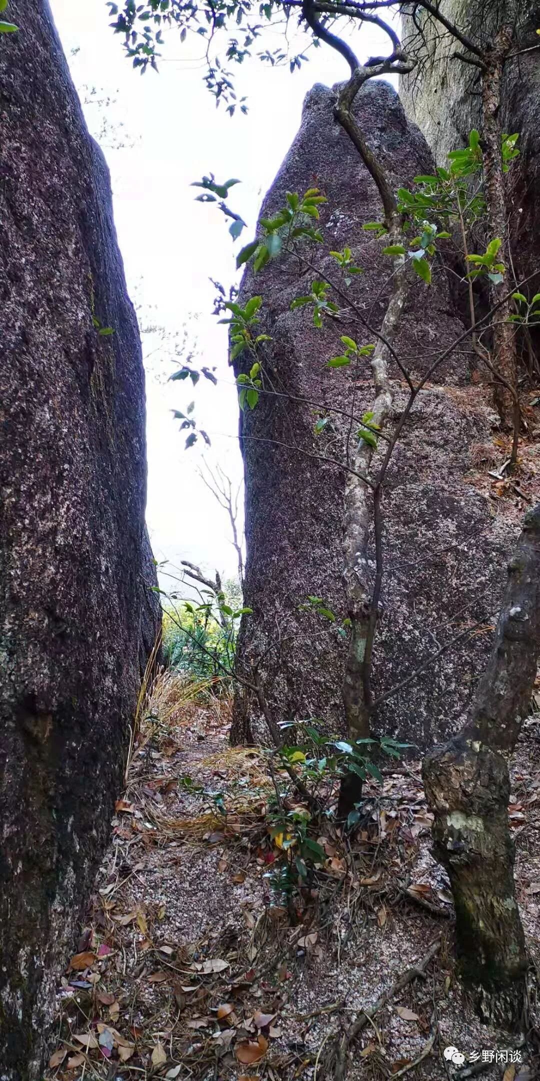 我们沿着溪谷前行数百米,若隐若现的古道引着我们又爬上西面的另一座山。这是介于云际峰与步仙桥之间的一条山矼,东西走向,上连鳌鱼峰,下止西海大峡谷,中部还有一处明显的断裂带,形似山“门”。我问园林工作人员,这座山矼叫什么名字,他们也不知道,姑且给它取名“石门峰”吧。“石门”宽不足一米,高数十米,南北均有古人凿出或搭砌的简易台阶,是从白云溪谷底穿行到云际峰下的必经之路。但从地形看,“山门”狭窄,登高路径陡峭,不适合大规模人员行走及运输生活物资,估计这段古道仅是附近僧人行走的便道而已,或者说只是白云溪古道的一条“支线”。这一点后来在钓桥一位园林工作人员那里得到证实,即真正的白云溪古道是沿着云际峰下的溪涧上行后再斜穿到天海的。