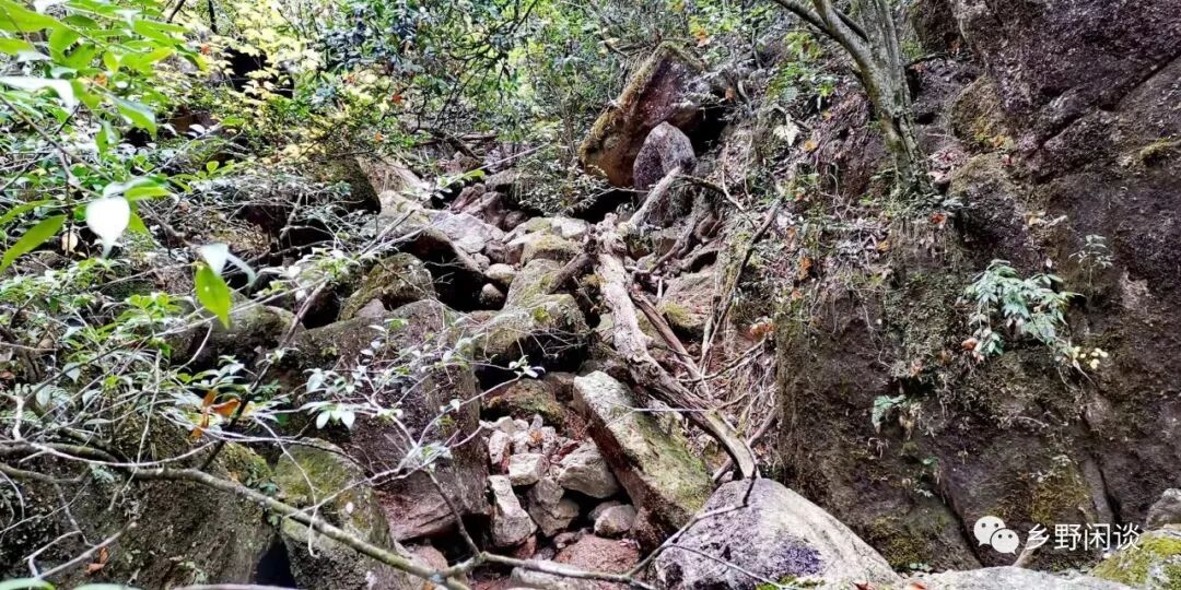 在这个世界上,唯有自然是永恒的,人及人类创造的一切物质都终将会被自然收回。因溪水浅流断断续续,我们可在溪涧的巨石间跨越穿行,或是从溪谷两边的树林中拉着树枝、拽着藤蔓下行。其间,我们发现了四五处古人开凿的石阶,三五步,六七级不等,小的仅够一只脚交错攀行,大的也有一两尺宽,最明显的是一段在山洞中穿行的古道。