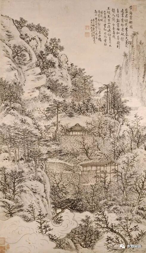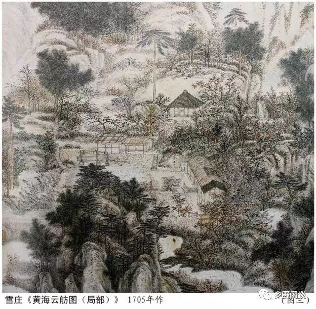(雪庄1718年画赠程庭的《黄海云舫图》)雪庄数次画了《云舫图》,差异较大,其中康熙四十四年(1705)所画的竟比五十七年(1718)那幅多了第一级的“如意亭”,从现场残落的瓦砾看,二层东面圮塌前也曾有建筑。而另一幅《云舫全图》竟有廨宇十余间。但有人考据,《云舫全图》所描绘的景象是雪庄理想中的云舫蓝图,并未真正投入建设,这一判断与现存遗址基本相符。但不管怎么说,雪庄对这习禅之所还是相当满意的,他曾在《题云舫图》中写道:“黄山最奇处,后海老僧家。几座屋如舫,四时花似霞。峰高寻有径,云阔望无涯。晴雨人来访,呼童但煮茶。”