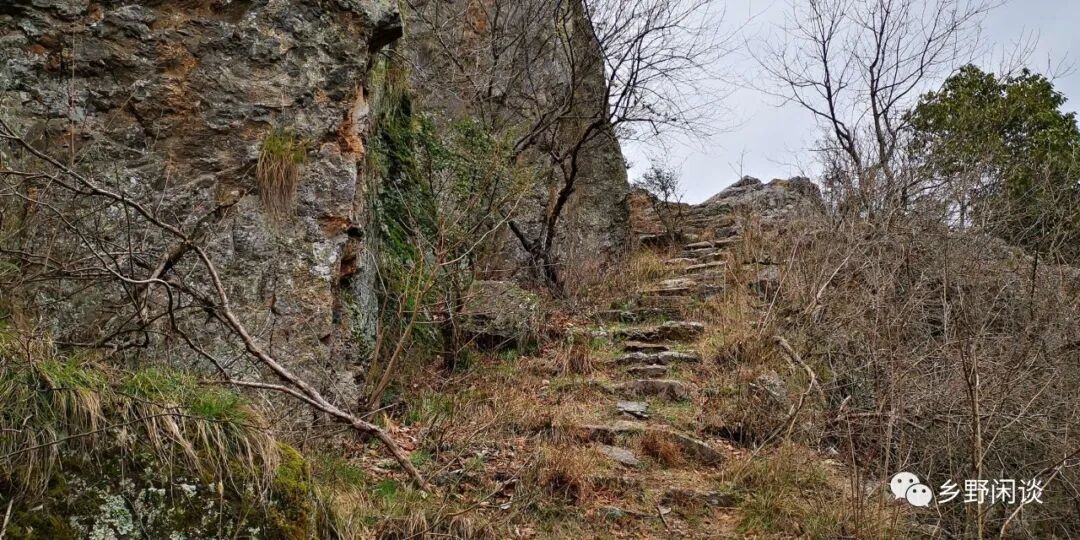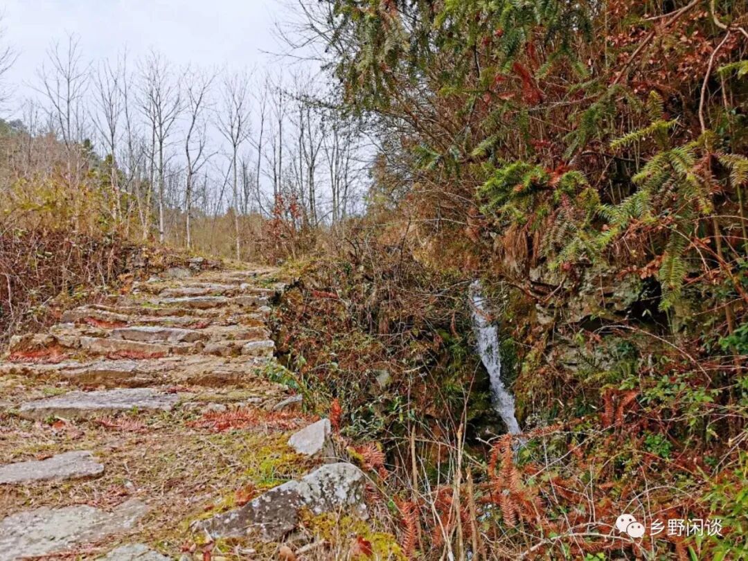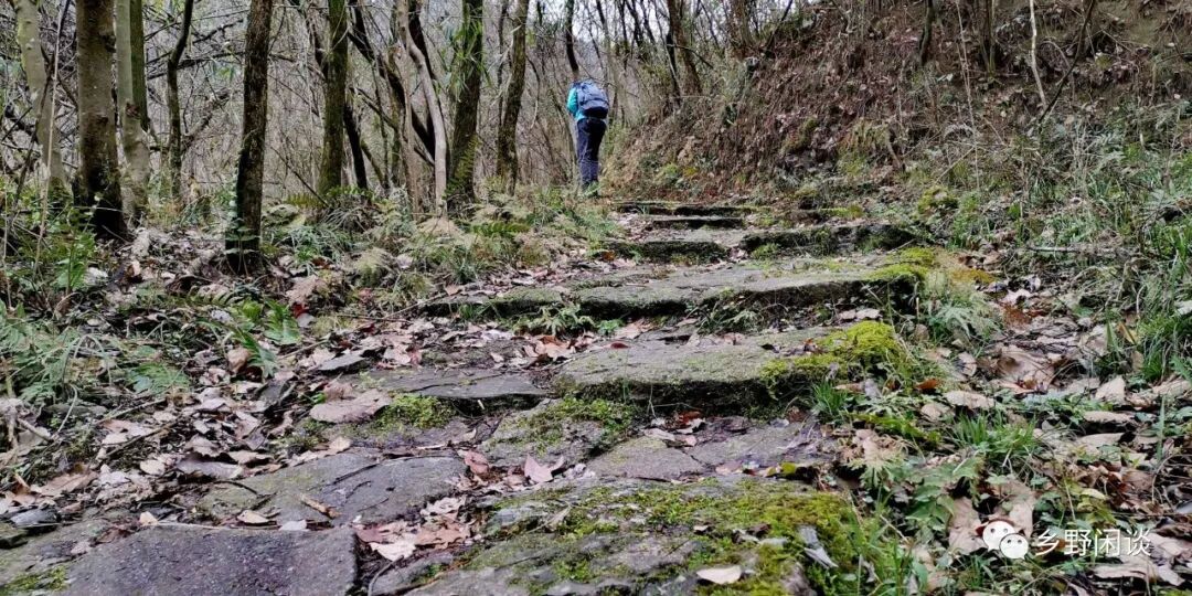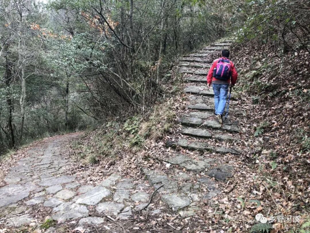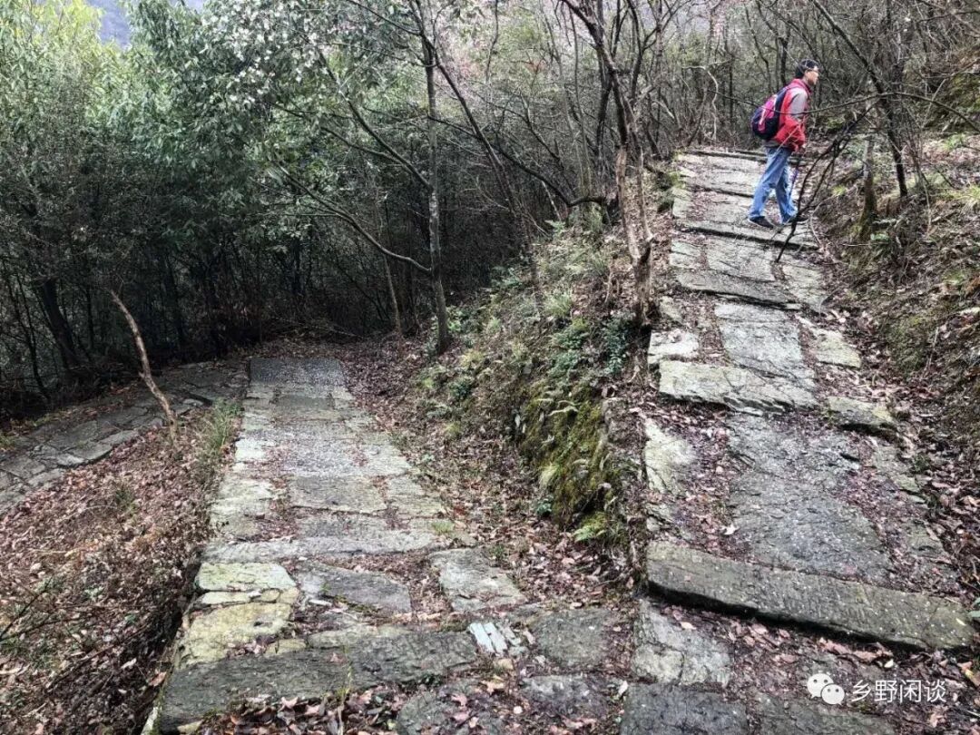 半岭不高,一眼到顶,左盘右绕的登山道宽达1.5米以上,且路面极为平缓,每步台阶间距近一米,高仅六七公分。这段Z字型登高路段有着“五里十八拐,拐拐都有故事摆”说法,到底有哪些扣人心弦的故事,恐怕现在已没有人能讲清了。这段“十八拐”的实际距离也没有五里,充其量千余米,我疾步快走,十五分钟即到达岭头。当然,正常登高需要半小时左右,只是今天一路走来都是平平缓缓的路,在这段登高路段上出一身畅快淋漓的汗也不枉这趟行程。