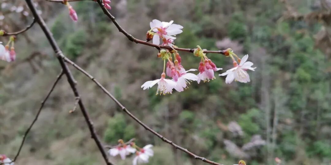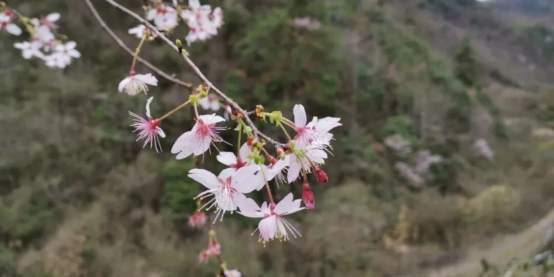 野樱花学名“迎春樱花”,当地人叫“画桃”,或是这个季节里这处古道上最靓的风景,它们并非桃花那样灿若红霞,也非梨花般洁白如洗。略施粉黛的矜持让它们在这荒野之中有着纯洁如水的身姿:每支伞形花序上撑出两股修长的花柄,玫红的花萼托着五片长圆形的花瓣,粉白中缀着腮红;十几支窈窕的花蕾顶着鹅黄的花药,如眼眸上的睫毛随风灵动。樱花品种很多,但这“迎春”二字是足以让冰雪消融的,它们冲破寒冬的封锁,拽着睡眼朦胧的春天闯入这萧瑟的旷野,不管是漫山添彩的花丛,还是眼前这随风摇曳的花束,都让人无法拒绝。