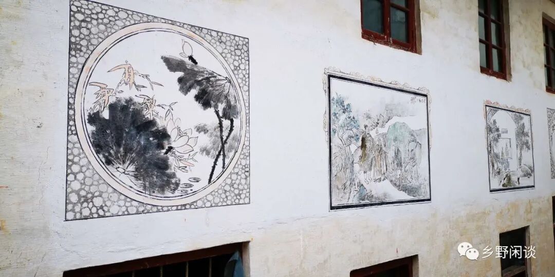 走在这个六百多年的古村中,最吸人眼球的是各家各户墙上的壁画,门楼上,窗眉间,屋檐下,随处可见。虽然这些壁画没砖雕、石雕、木雕那样高雅精致,但在这个百余户的小村庄里有如此异彩纷呈的壁画,在徽州古村中实为罕见。这个偏远山村的壁画记录了中国几百年来思想文化的变迁:初为明清时期渲染儒家思想的人物故事;再者是解放前后新中国普天同庆的画幅;后来是上世纪六七十年代文革期间的宣传画;现存大部分是近年以山水及新农村为题材的现代画作。