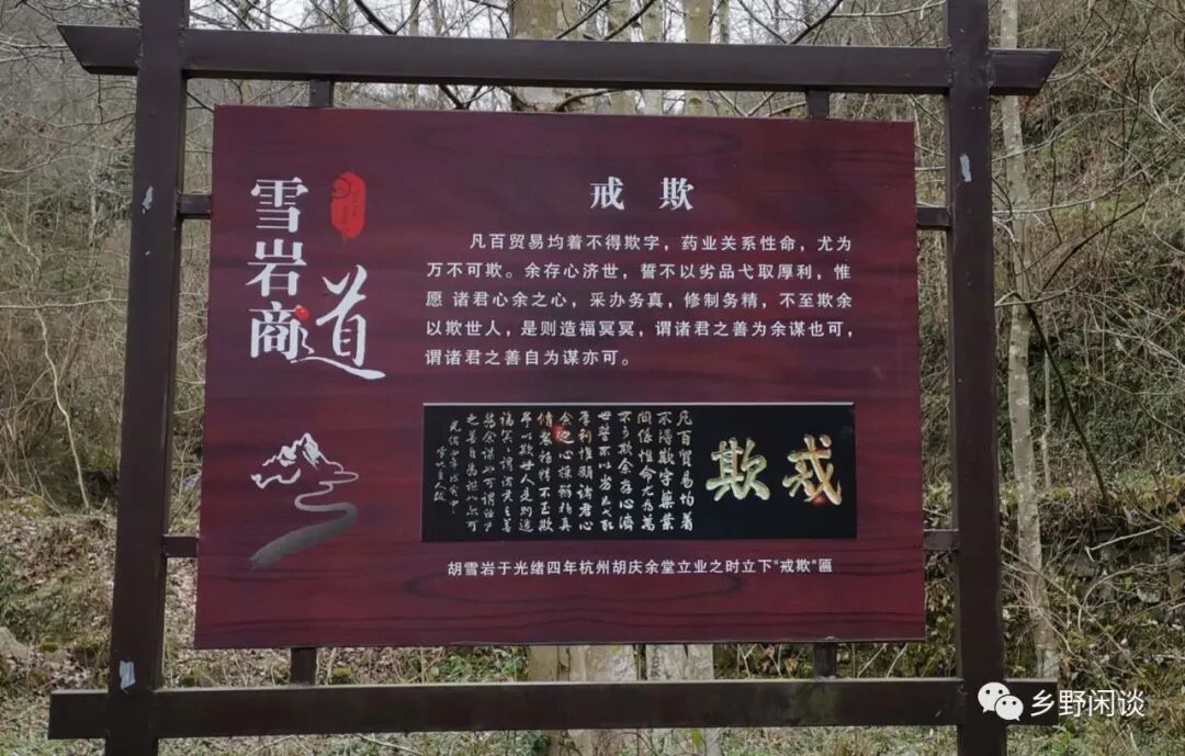 胡雪岩(1823—1885)出生在离汪坑村五里外的湖里村,早年丧父,儿时家境贫寒。据传,有一天,他在古道边放牛,在路亭里见一蓝布包袱,里面除了衣衫帕袜外,还有一包白银,于是他就地坐等失主归来。临近傍晚,匆匆寻来的失主见胡雪岩见利守义,诚实伶俐,且知其家贫如洗,经其母应允后,携其前往歙县南源口米行学徒,后将其推荐至杭州钱庄,终成中国晚清第一豪商。从地理位置上看,胡雪岩从家出发前往南源口应走黄连凹古道,走旱路到杭州则需经半岭古道,不知这条路上的青石板是否来自这位红顶商人的资助。当然清末徽州,“粤匪长毛”肆虐,兵荒马乱,即使有捐赠,也未必有详细的史料记载。但不管怎样,一代巨商的滋养,这条路自然有了灵气,称之“雪岩商道”,适度注入一点名人效应,倒也未尝不可。