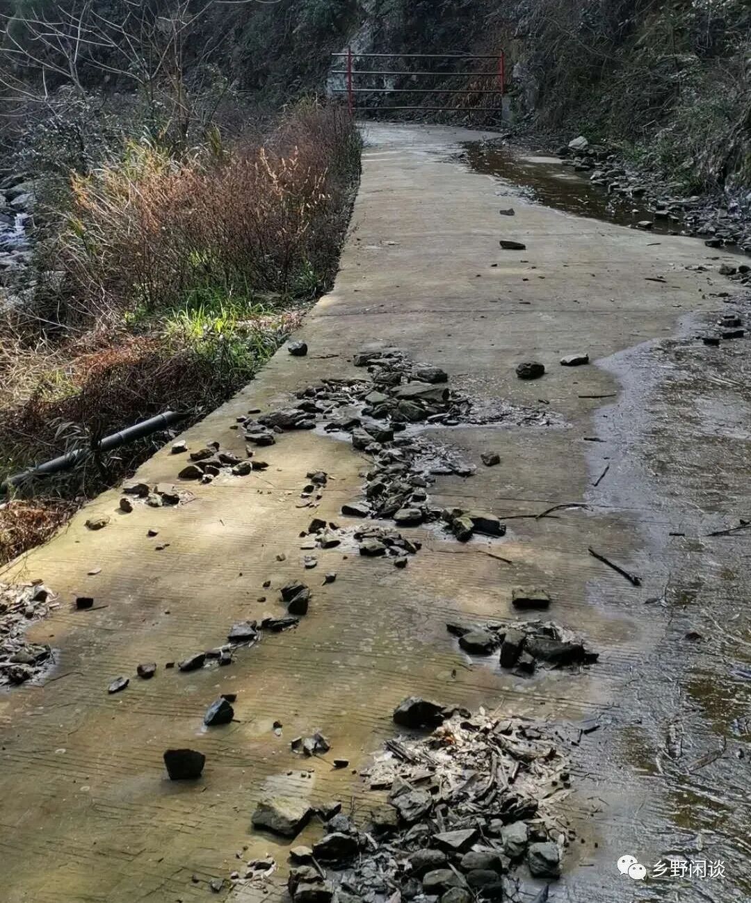 随着水泥路沿谷底溪流不断迂回爬升,偶有倒地的毛竹、树枝挡住去路,路上落石也越来越多,有两处山体塌方占据了半幅路面。前行半小时后,水泥路被一道铁栅栏彻底堵死,前不能行,后不能转,只能在那狭窄的山路上倒车后退。尤其那塌方的半幅路面,左瞰深谷,右擦落石,两边车距不足两公分,简直是特级驾照考试的路段。好不容易找到掉头路段,大家都已惊出一身冷汗。