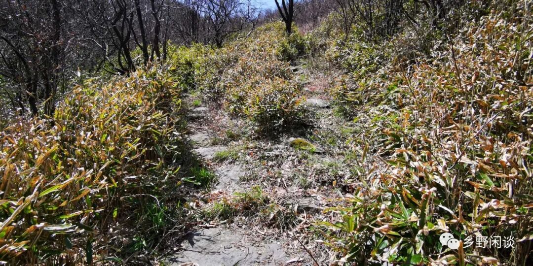从路亭遗址到举公岭岭头,大部分古道都是这个状态,且多处路段长满齐人高的箬叶,还有带刺的树莓(覆盆子)或高粱泡丛蔓。好在大部分灌木刚吐绿,地上茅草也刚冒芽,古道所形成的廊道尚可行走。祁门蛇多,再过个把月,这些稠密青翠、阴凉潮湿的箬叶林或茅草丛里将是这些爬行动物天堂,谁还敢走这条路。这条路上还有另一种危险动物——野猪,它们也是损坏这条古道的祸首之一。在万物萧瑟的季节,它们翻开路面石板,也许能找到躲在里面度冬的蚯蚓、蚕蛹之类的食物。虽然这些小虫也没多少肉,但总有点荤腥,比草根树叶强多了。运气好时也许还能翻出一两条冬眠中的蛇类,去年11月份走黟县棠梨岭古道时,就在古道石板下面翻出两条大蛇,要是野猪出手,那将是一份饕餮大餐。这里随处可见被野猪拱过的痕迹,很多被翻开的泥土还是湿漉漉的,在山腰一条小溪附近,我们还见到两头正在路上打架抢食的小野猪仔。殊不知,这么小的野猪仔是必然是有母猪带着外出觅食,如果有人正好与母野猪正面相遇,母爱的力量会让野猪毫不犹豫地向人发起攻击,估计在野猪眼里,我们几个也仅仅是两条腿走路的“小动物”而已。好在小野猪仔很快跑进灌木丛中,估计是俩贪玩落单的小家伙。