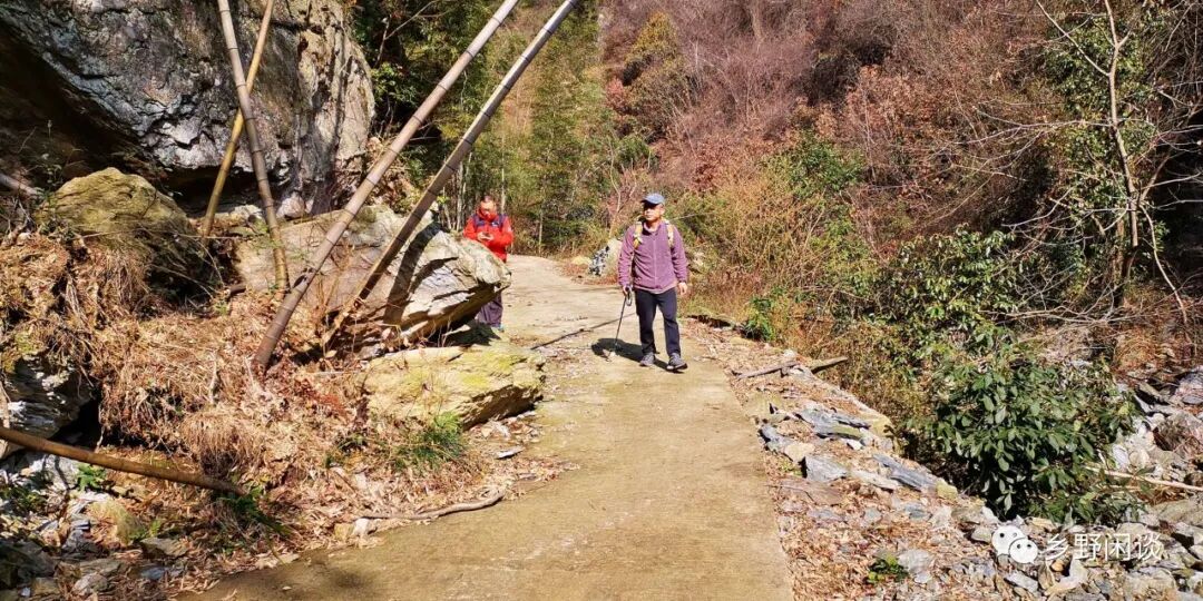 我们一路导航至安陵镇,往南拐入一条逼仄的峡谷,在这青山耸翠、绿水萦绕的山沟里穿行,万能的导航也瞬间成了哑巴。水泥路缘溪而入,仅一车通行,路边的茅草擦着车身,偶有一两株开得正盛的迎春樱花垂挂在车窗外,几片粉红的花瓣缤纷飘落,掉在汽车挡风玻璃或引擎盖上,然后随风儿飞进路边的绿丛中,红白嫣然,像群飞舞的蝴蝶。这样幽深的山谷里也没有汽车来往,也就少了会车之扰。前行约五公里,峡谷豁然开朗,群山环翠中十几栋民房掩映其间,村居山谷,粉墙黑瓦,修竹玉立,名副其实的“金竹坑”。只是当年通南畅北、日夜喧嚣的“岭脚村”,如今只剩旷野里几声鸟鸣、几度狗吠,清冷焦躁。“金竹坑”并非山坞尽头,水泥路穿过村庄后仍继续向山坳深处延伸,我们继续驱车前行,寻找古道起点。