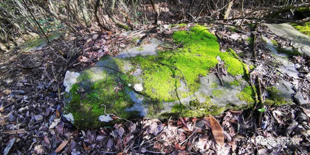 从安凌镇转入山路到进入古道,我们将近花费了两小时,在我近年徒步历史上,这是创记录的一次。这也从另一个角度说明这条古道早已淡出百姓的生活视野,在我们接下来的行走中也见证了这一点。机耕路在竹林中缓缓而上行,约二十分钟到达一处平坦的小山脊。这块约半亩的平地已长满毛竹,从周边石磅上不规则的黑色石块以及四周散落的块石看,这里该是一处普通的棚屋或路亭遗址。我们也在这里终于见到古道痕迹,路面有零星石板,歪歪斜斜的。这段山体坡度较大,横穿山坡的路面大部分已滑塌,几米或十几米外的竹林中尚可见滑落的路面石板。这些石板长一米左右,基本都经过加工平整,也就是说当年这条古道的建造规格应在中上等标准。