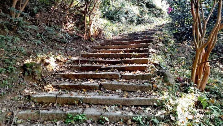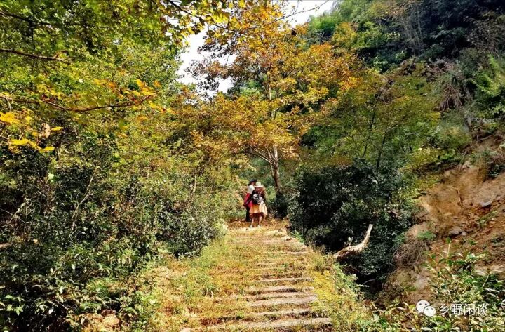 古道穿行在田埂间,或是被杂草、尘土覆盖,或是沉降后形成泥淖,已不再规整。但这些被磨砺得没棱没角青石板,所映射出来的,依然是昔日的喧嚣和厚重。踩在这些黛青色的石板上,你才能真正体会到“在徽州,随意踩到一块石头,就会触动一个朝代”,你的思绪会不由自主穿越到唐宋时期的歙砚“眉子石”、“金星石”、“龙尾石”。哪怕一小块“老坑”砚石,也超过我等工薪阶层几年的俸禄。当然,即使踩到一块和田玉,我也未必识货。我们走在这些早已失去交通功能的古道上,除了磨脚出汗外,或许在每个人心中,都有那么一片远方的牧歌田园。古道路边,民居错落,梯田跌宕,油菜铁红,那些没有秋种的稻茬上,又长出了新绿,田埂上的野葱开出一支支紫色的花束,山坡上的乌桕树叶已染上一抹腮红,一片秋意斑斓的样子。古道沿峡谷行进,约一小时,到达谷底,开始盘山登高。