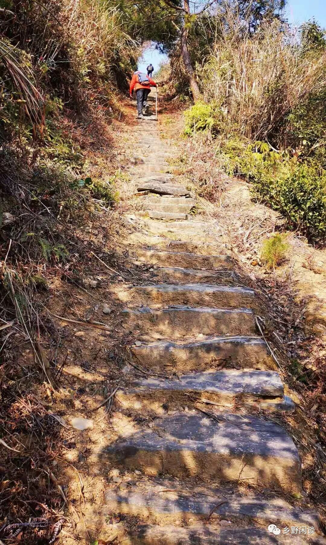 传说归传说,终究已是胭脂岗的过去,和曾经人流如织的古道一样,是时代在新安江与阊江分水岭上留下的一段记忆,一段淡出人们视野、且正在慢慢消失的记忆。塘坑头周边山势陡峭,是我们上午已见识过的,但胭脂岗的蹬道还是出乎我们预料,与牛角岭古道不同的是,这段古道沿山体直线攀高。路面虽宽至1米,石阶也基本平整,但其高度是普通古道台阶的两倍,与现代景区台阶标准相近。据目测,古道最陡处坡度达40度以上,几乎达到景区地轨缆车限高的标准。想想当年塘坑头人,挑着百斤重担,常年颤颤悠悠地攀爬在这条蹬道上,是何等艰辛不易!
