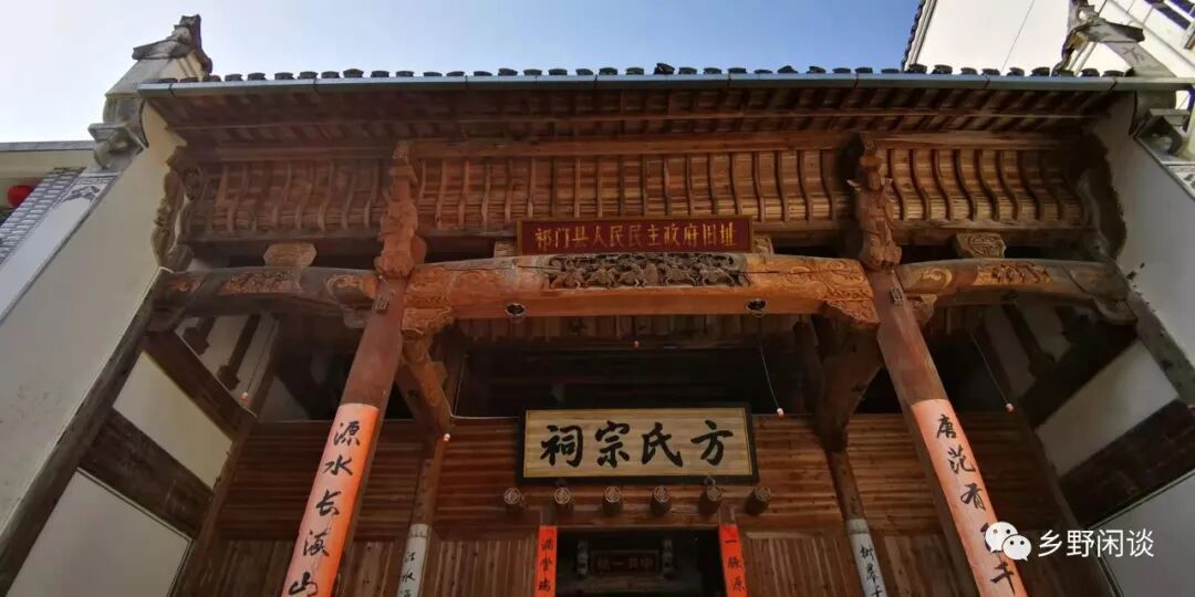 方家祠堂规模不大,前后三进,三开间。第一进为戏台,中为庭院,也是看戏的“看场”。二进为祠堂正门,外横梁上方悬挂“祁门县人民民主政府”牌匾,下方是“方氏宗祠”四个大字。走进祠内,中有天井,上悬“中共一统”匾额,正厅照壁题有“光裕堂”三字。照壁后为第三进,也是祠堂的享堂,有天井及先人“排位”。整座祠堂除正厅青石地面及个别梁柱外,大部分为“修旧如旧”的复制品,其整体格局基本保持原貌。