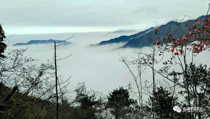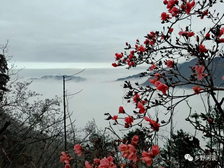 或许是白际岭上“千金台”、“万金台”那两个“高大上”村名的造化。“千金散尽还复来”,当我们再次到达山顶时,顿时天开雾散,乳白的云雾填平山峦间的沟壑,一座座山峰像大海里的岛屿一样,在云雾飘移中游弋着,宛如人间仙境。天脚处,映出一抹太阳的霞光,云霞顿时分成不同色彩的层级,若隐若现的山峰犹如海市蜃楼一般。