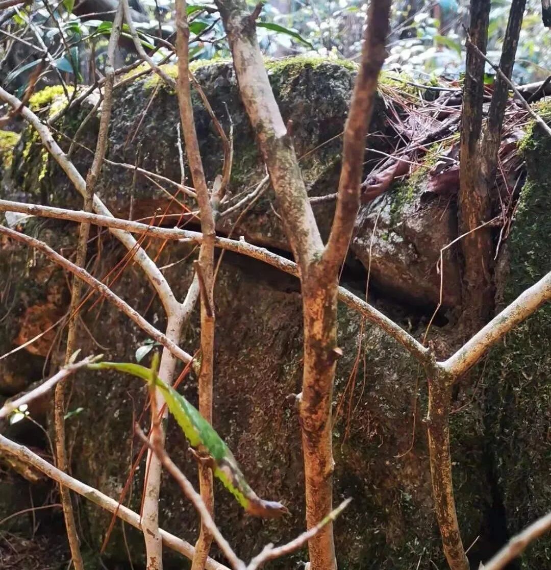 但我认为,“梅屋”海拔虽略高于温泉、钓桥、松谷,与桃花峰、云谷相近,地形气候也基本相似,却与“崖悬径险,草木繁密,鸷兽时出,云雾尤为常蔽”的眉毛峰相差甚远。事实也确如我所料,登高四十分钟,到达古蹬道岭头,转入山脊西麓,进入一片相对平坦的山坳里,即WQ-32号消防水池处,无意中看到一株茶树。此处海拔1100余米,距眉毛峰顶不足300米,距“眉毛”处约百余米,基本为落叶灌木,我们在其中找到数十株低矮的茶树。据目测,附近约五六亩山林内,至少有几百株这样的茶树,这些茶树单株不大,每株长有几股到十几股细枝,大的仅拇指般粗细。茶树叶片卵型,叶长可达近10公分,比他处略长,略薄,少光泽,且稀稀拉拉的,部分有明显冻伤痕迹。细枝杪头的新芽仅米粒般大小,距采摘时间至少还有一月以上。