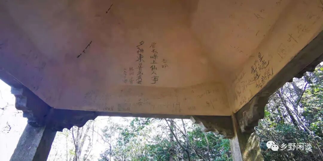 万松亭建于1964年,花岗岩石柱,砼筑攒尖顶,四角挑檐,四根石柱间有条石坐凳相连。亭前一块指路碑碎片上,模糊可见“云谷寺”、“温泉”字样。由于久无人至,亭内已覆一层枯黄松针,石亭白色内顶有诸多“到此一游”之类的涂鸦,最早落款为“74.3.10”,当然也不乏“眉毛峰上仙人亭,夕阳东升出海云”这样的打油诗。这又让我想到古人在黄山留下的诸多摩崖石刻,时间是一把刷子,经过历史的反复淘洗,留下来的都是文化。