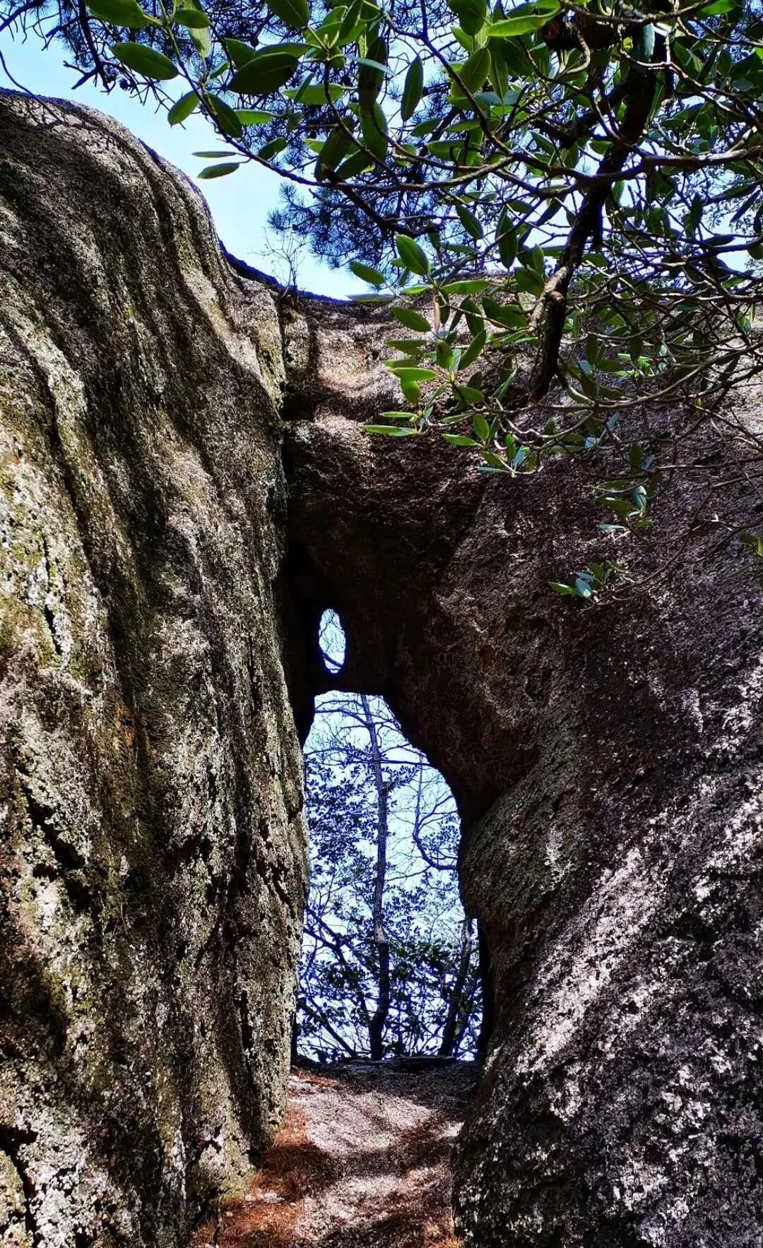 此洞并非吴日宣文中所描述的石洞,其地理位置、面积、形状构造等特征上都有明显差异。距“岩洞”数十米、临近峰顶处,还有一天然“门洞”,“门”高近两米,宽不足一米,上部略窄,其上还有一个橄榄型小洞,不足头部伸进。“门洞”上方“天桥”可供人行走,为山峰绝顶,立于其上,西海诸峰尽收眼底。当然,孓立“天桥”之上,下临深渊,孤无可攀,还是需要一点胆量的。遗憾的是我找遍《黄山图经》(宋,无名氏著)、《黄山志》(清康熙五年版)、《黄山指南》(民国十八年)等史料,既不明该峰名称,也未见石洞及“天桥”的文字记载。