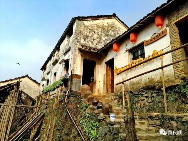 跌宕错落的房屋沿着山脊两边,一层叠着一层向上矗立着。这里的每一栋房屋都建在高高的石塝上,房前屋后的每一尺平地都是对山体的雕琢和再造。最具特色是每家门前用竹木搭建的挑空晒台,尤其“第一层”环绕村庄的三尺步道,已搭成一条“宽阔”的凌空“天街”。竹木的自然色彩与墙面的土黄、泥瓦的黛黑相衬,其间还晾晒或堆放着时令瓜果或蔬菜,形成一幅活色生香的徽州山居图。