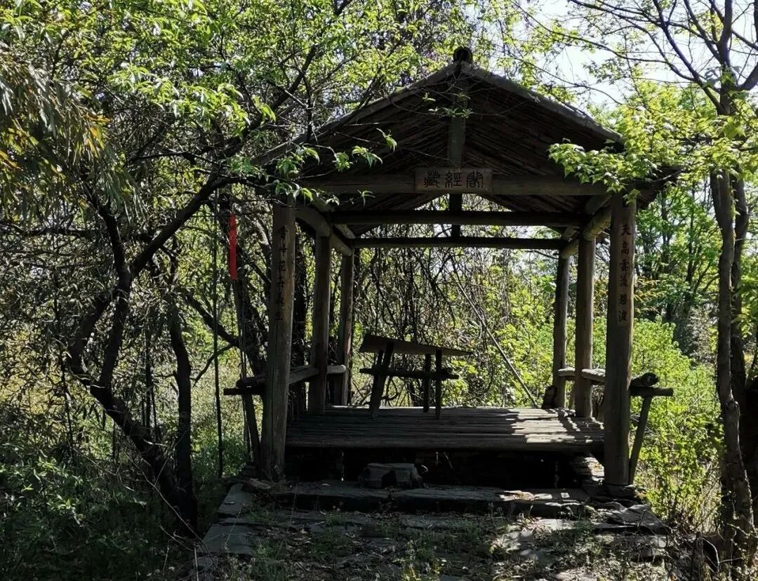 但不管怎样,人在佛前,总是极力释放心中之善,收敛内心之恶的。善多了,恶少了,这个社会自然美好了。登高约40分钟,到达大天寺遗址。遗址位于梯状山脊节点,后靠峰,前瞰谷,坐南朝北,视野开阔。整个建筑遗址面积1000多平方米,已长满杂草和竹子,有少量灌木丛,担杵般粗细,原有建筑格局已不明显。遗址北面砌有一石坛,依山就势,其上架有木柱檩椽,鸳鸯瓦,如一座路亭。亭额嵌一木板,用墨汁写有“藏经阁”三字。