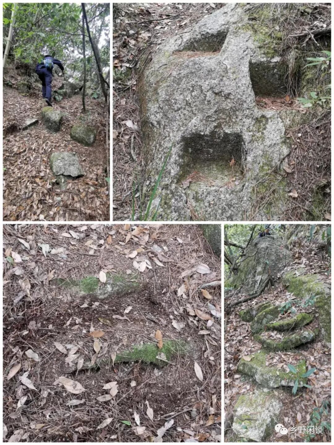 因久无人行,坳中林密坡陡,山石叠加,偶有枯木阻拦,行走十分艰难。我沿山坳上行约50米,发现部分块石有人工垒砌痕迹,再继续上行,可见零星石阶,最多处达十几步。此时来葆所走路径已被巨石绝壁阻挡,遂右转横穿与我汇合,春生、勇军也陆续上来。四人沿山坳上行至云谷索道缆绳下方,又被巨石所阻,左行十多米,未见任何古道痕迹,遂右行向山脊攀高,复见罗汉石。