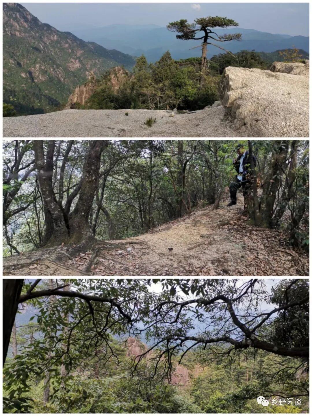 越岭而下为“一道河”,有古道至“通天坦”,远程可达罗村、松谷庵等地,为东黄山正在开发的区域。我们稍停片刻后即沿左山脊上行。上行古道在林中盘折而上,渐陡,砂石路面为主,覆有枯枝落叶,甚滑,需拽着路边灌木方可上行。途中偶有台阶,或块石垒砌,或凿石成级。路径明显,无岔路。继续行走20多分钟,再上一岭,即“二道岭”。岭头为花岗岩风化而成的沙砾,与白沙矼类似。此处左望罗汉峰高耸如塔,罗汉石突兀而出,右看仙都峰,峭壁如墙。