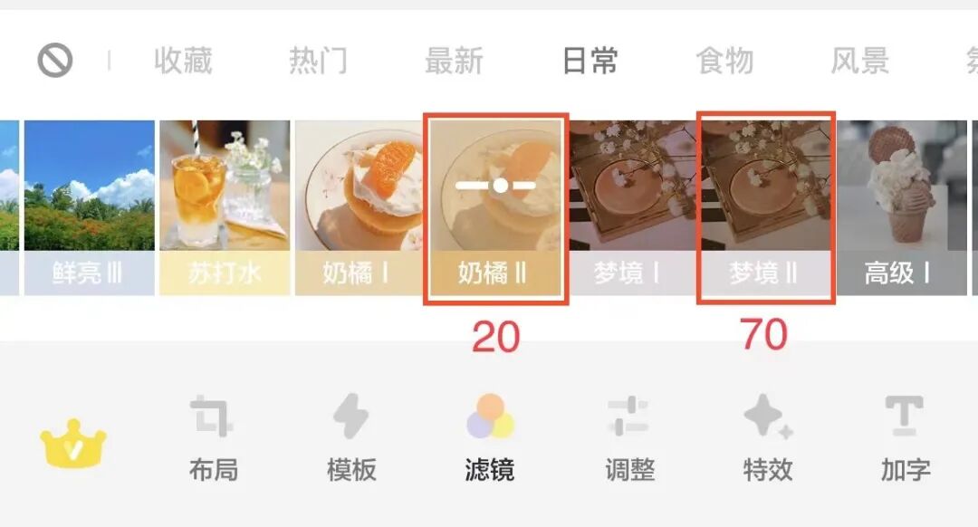 这里又用到大家的“老朋友”黄油相机了,用到“奶橘ll”和“梦境ll”这两款滤镜叠加的效果。具体的可以根据图片自生调节参数哦~