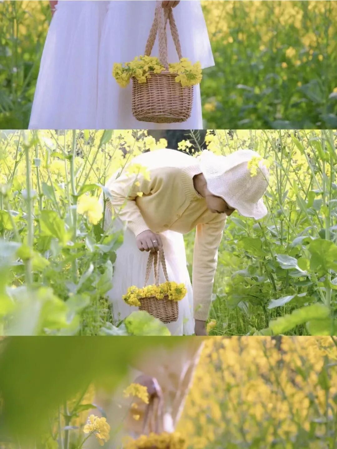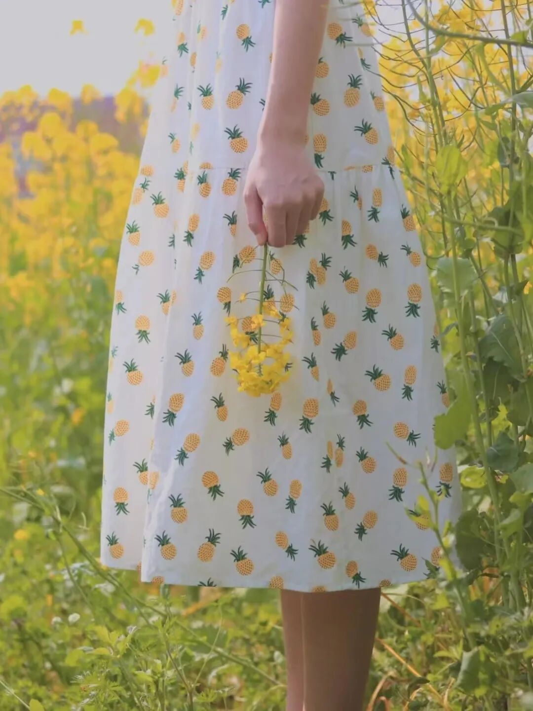 手垂下来拿着油菜花和裙子呼应拍下局部也很好看呢~