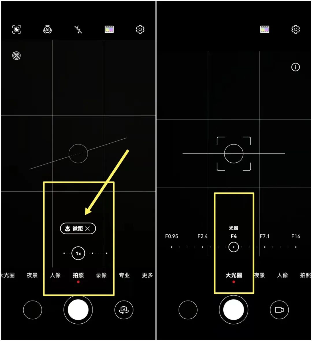 现在的大部分智能手机都有“微距”和“大光圈”拍照模式,找到之后,直接拍摄油菜花就可以了,这两个拍照模式更容易拍出细节。微距模式和大光圈模式