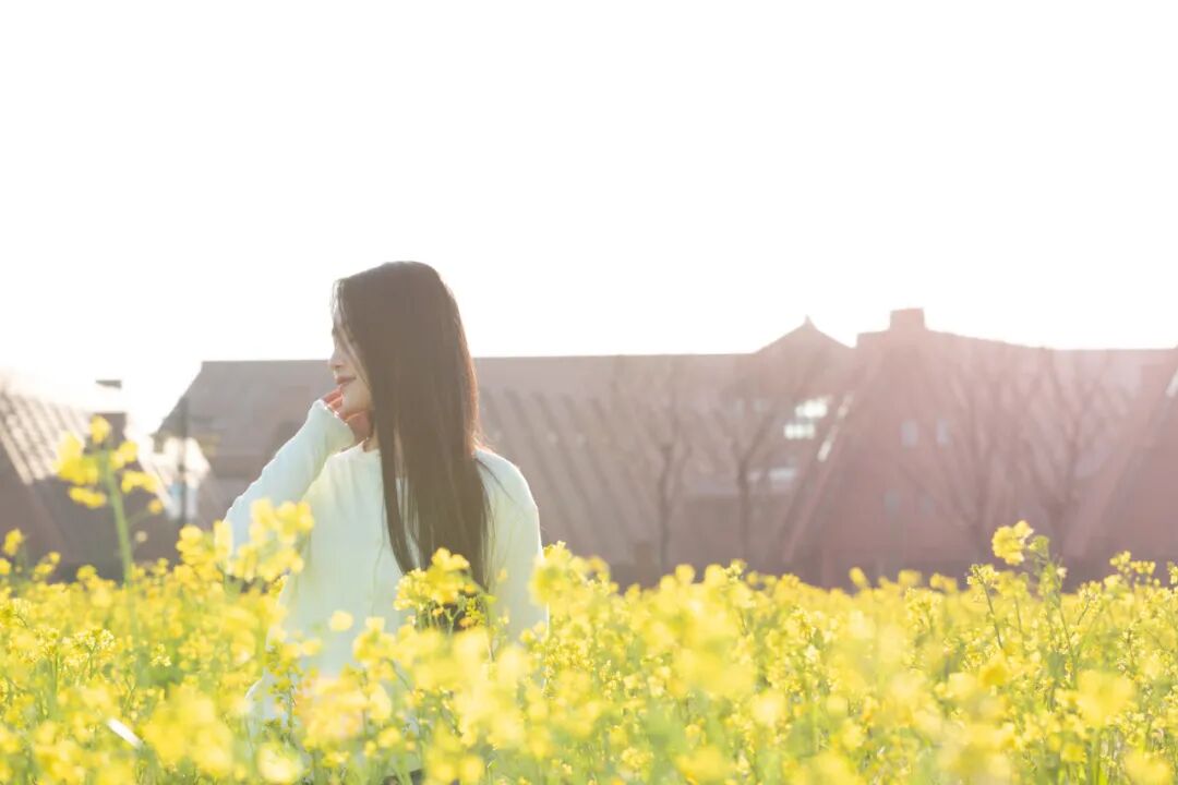 另外,在金黄色的油菜花田里拍摄,要遵循“白加黑减”法则,根据光线情况提高曝光补偿(EV)1-2档,避免照片色彩发灰发暗。