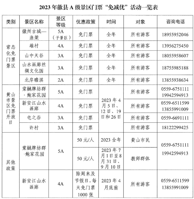 1.2023年全年,黄山市民凭身份证或户口本享受50元/人门票优惠;