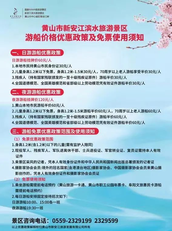 *新安江山水画廊景区:2023年4月份,除法定节假日、周末、免门票开放日外,每天前1000名线下购买游船的游客免除景区门票(以景区当日现场统计为准)。